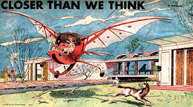 Sicher, unsere Autos werden immer schneller - und die durchschnittliche Reisegeschwindigkeit sinkt trotzdem. Und manchmal geht eben gar nichts mehr. Im Stau stehen dann Porsche und Ente vereint - gleicher Stau für alle Bürger! Kein Problem, mit dem richtigen Beifahrer. Schnell entspinnt sich ein Gespräch - z.B. über "Autobazillen" und fliegende Autos. Bruce Willis, klar der Flugtaxi-Chauffeur! Na und James Bond sowieso! Der Atomford Nucleon aus den Fünfzigern, und gab's nicht auch mal ein "Fliewatüüt"?