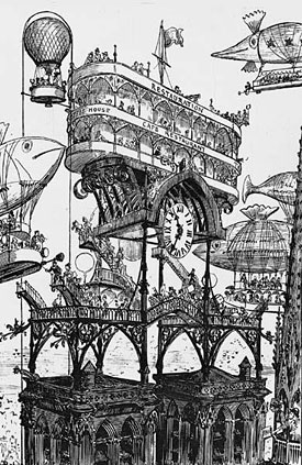 K: Wenn ich es richtig in Erinnerung habe, ist die Idee für das Flugauto nicht aus dem Frust über den Stau auf der Autobahn heraus geboren worden. Sie ist älter als die Autobahnen - vielleicht so alt wie das Automobil selbst. Wenn ich mir die Schokoladenbildchen von 1900 anschaue oder auch die wunderschönen Karikaturen von Albert Robida: Da fliegen Luftdroschken und Aero-Omnibusse über Paris, holen die Bürger von ihrem Balkon im sechsten Stock zum Opernbesuch ab. Notre Dame ist zur zentralen Luftibus-Anlegestelle umgebaut worden, die Luftpolizei jagt hinter fliegenden Verbrechern her. Fürchterlich, man muss nun auch die Fenster in den oberen Etagen vergittern.