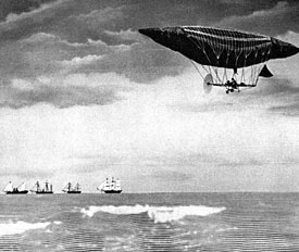 K: Das sind aber lenkbare Luftschiffe mit Beinmuskel-Antrieb, sehr frei nach Jules Verne, der übrigens in einem anderen Roman sogar schon "fusiforme", also geschossförmige, Drei-Medien-Fahrzeuge beschreibt: Sie bewegen sich unter Wasser, auf der Erde, in der Luft.